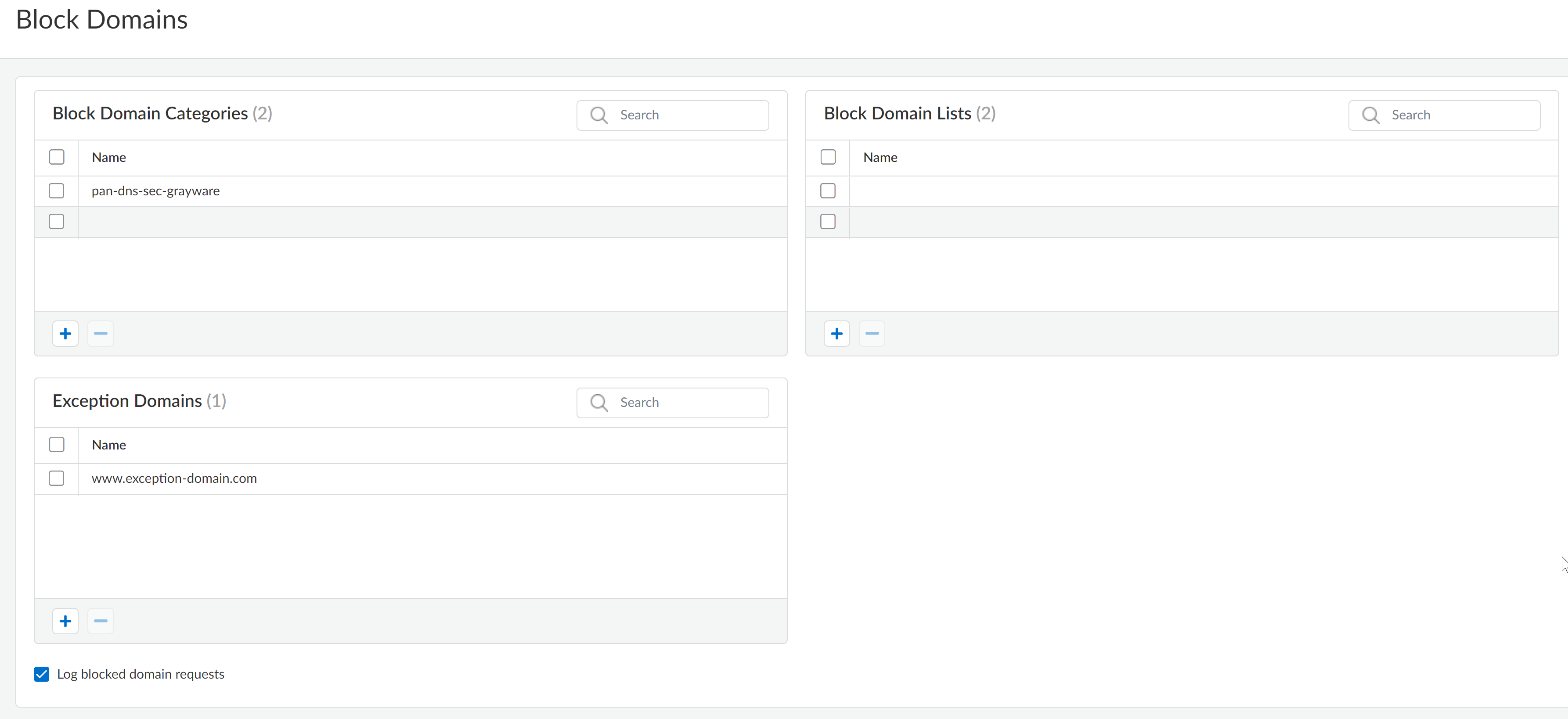 2. (Optional)Add Block Domain Categories, Block Domain Lists, or any domains that are Exception Domains because they are sinkholed due to matching one or more of the DNS Security categories.