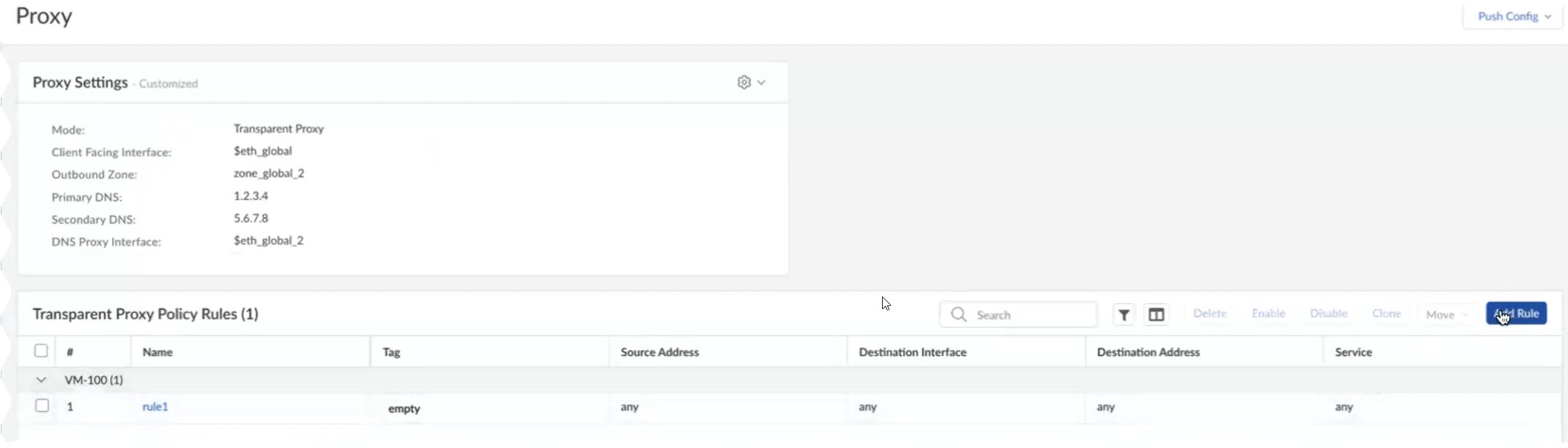 These are a set of rules that determine what traffic passes through the proxy. After you push your configuration, these rules create Destination NAT rules on your devices, which apply NAT to the traffic that passes through the loopback interface configured earlier.