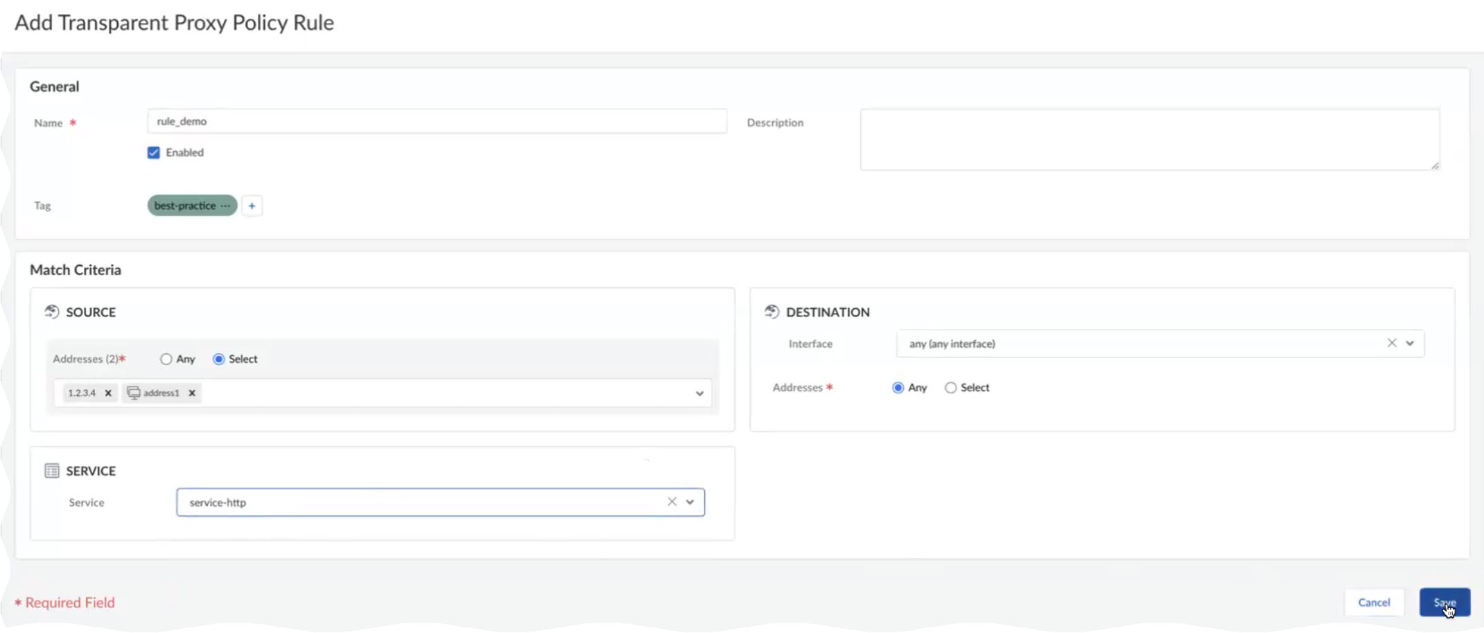 5. Specify a destination address or leave it as Any.