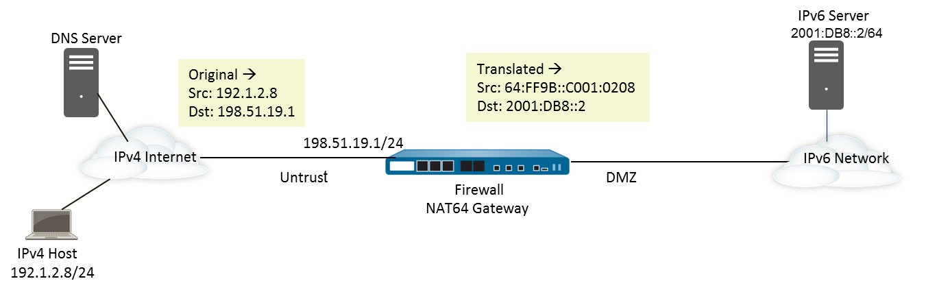 The firewall encodes the source IPv4 address into Well-Known Prefix 64:FF9B::/96 as defined in RFC 6052. The translated destination address is the actual IPv6 address. The use case for IPv4-initiated communication is typically when an organization is providing access from the public, untrust zone to an IPv6 server in the organization’s DMZ zone. This topology does not use a DNS64 server.
