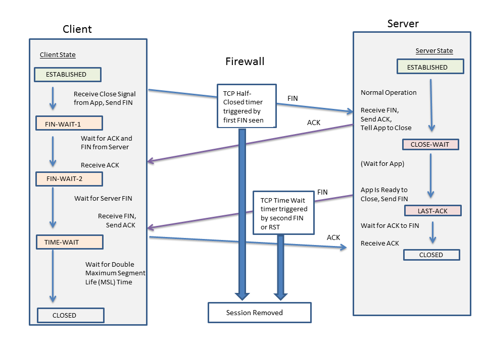 The TCP connection termination procedure uses a TCP Half Closed timer, which is triggered by the first FIN the firewall sees for a session. The timer is named TCP Half Closed because only one side of the connection has sent a FIN. A second timer, TCP Time Wait, is triggered by the second FIN or a RST.