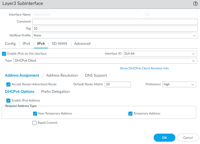 - Select NetworkInterfacesEthernet or select NetworkInterfacesEthernet and select an AE interface, or select NetworkInterfacesVLAN.For Interface Type, select Layer3.Add Subinterface if you want a single Ethernet or VLAN interface facing the ISP to be separated into subinterfaces.Select IPv6 and Enable IPv6 on the interface.Configure an interface that faces the ISP to be a DHCPv6 client and request its leased, temporary and/or non-temporary IPv6 address.