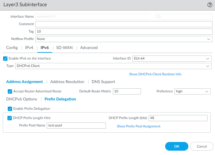 Select DHCPv6 Options and Enable IPv6 Address. Request a Non-Temporary and/or Temporary Address.Select Prefix Delegation and Enable Prefix Delegation.