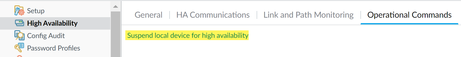 - Log in to the firewall web interface of active secondary firewall HA peer.Select DeviceHigh AvailabilityOperational Commands and Suspend local device for high availability.In the bottom-right corner, verify that the state is suspended.The resulting failover should cause the primary passive HA peer to transition to active state.The resulting failover verifies that HA failover is functioning properly before you upgrade.(HA firewall upgrades only) Upgrade the second HA peer in each HA pair.