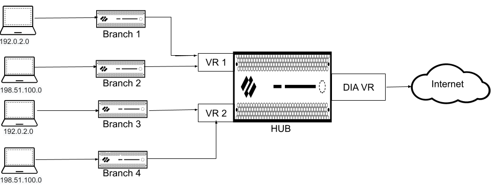 - A hub with multiple virtual router configuration logically separates the routing for each branch office that it is connected with.