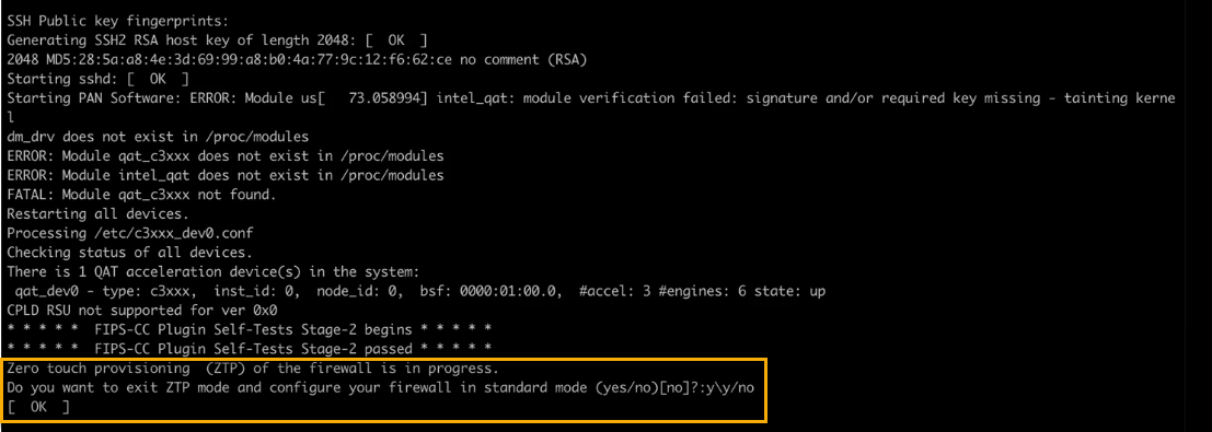 Do you want to exit ZTP mode and configure your firewall in standard mode (yes/no)[no]?