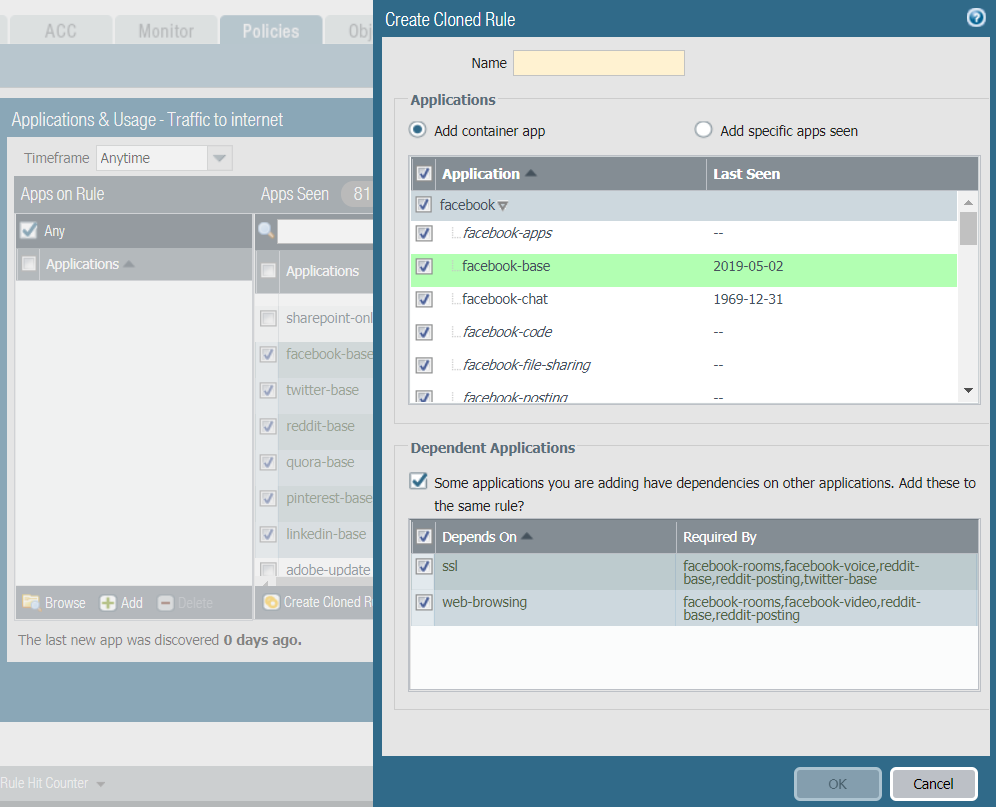 Create Cloned Rule also shows the application dependencies of the selected applications. Because we selected social applications but not web-browsing or ssl, web-browsing and ssl are among the listed application dependencies.