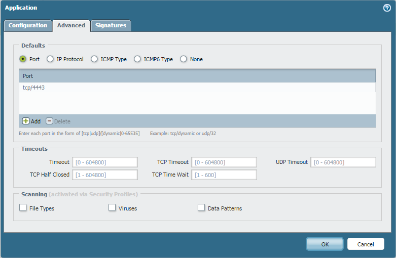 Define details about the application, such as the underlying protocol, the port number the application runs on, the timeout values, and any types of scanning you want to be able to perform on the traffic.On the Advanced tab, define settings that will allow the firewall to identify the application protocol:- Specify the default ports or protocol that the application uses.