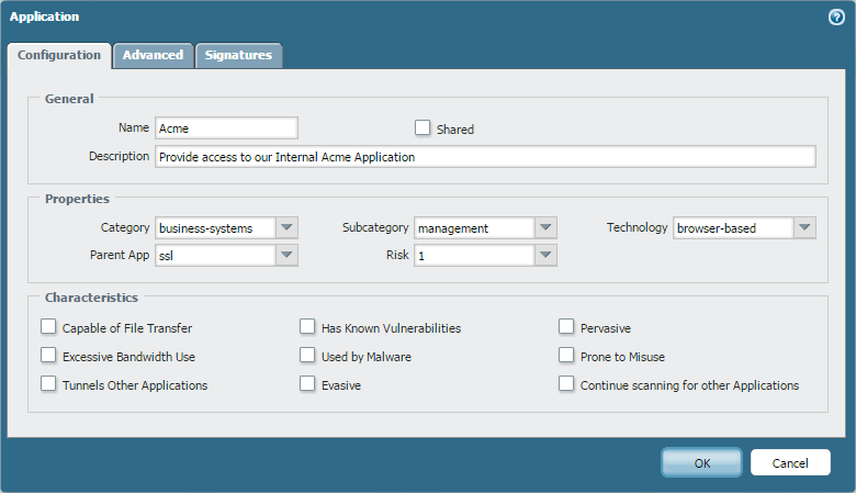 Add the custom application.- Select ObjectsApplications and click Add.On the Configuration tab, enter a Name and a Description for the custom application that will help other administrators understand why you created the application.(Optional) Select Shared to create the object in a shared location for access as a shared object in Panorama or for use across all virtual systems in a multiple virtual system firewall.Define the application Properties and Characteristics.