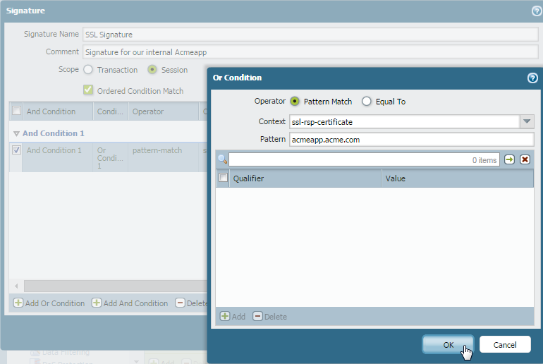 Define the criteria that the firewall will use to match the traffic to the new application.You will use the information you gathered from the packet captures to specify unique string context values that the firewall can use to match patterns in the application traffic.- On the Signatures tab, click Add and define a Signature Name and optionally a Comment to provide information about how you intend to use this signature.Specify the Scope of the signature: whether it matches to a full Session or a single Transaction.Specify conditions to define signatures by clicking Add And Condition or Add Or Condition.Select an Operator to define the type of match conditions you will use: Pattern Match or Equal To.