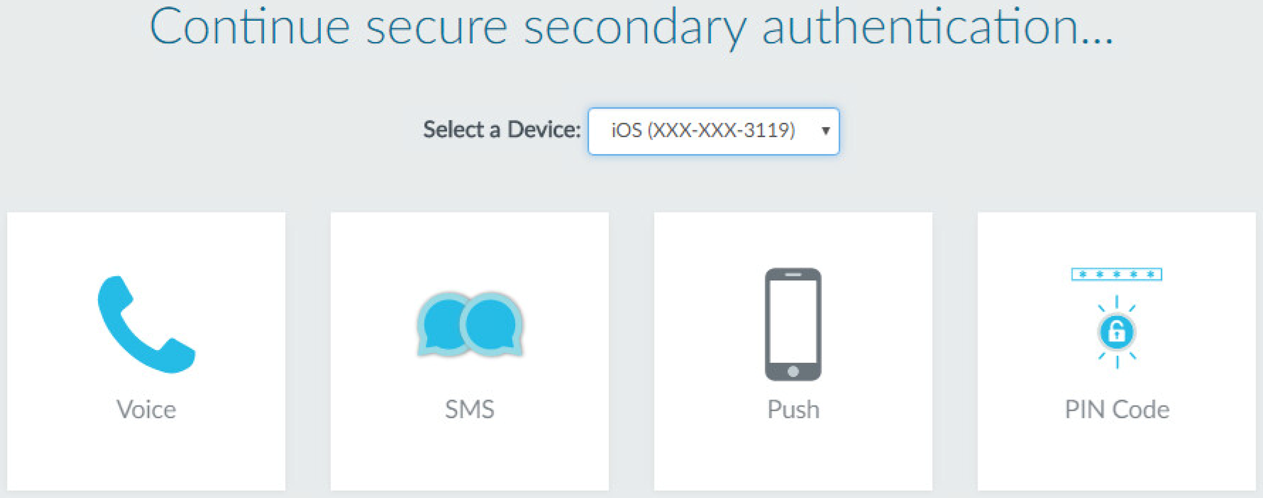 Enter your user credentials for the first authentication challenge.The firewall then displays an MFA login page for the next authentication factor. For example, the MFA service might prompt you to select the Voice, SMS, push, or PIN code (OTP) authentication method. If you select push, your phone prompts you to approve the authentication.