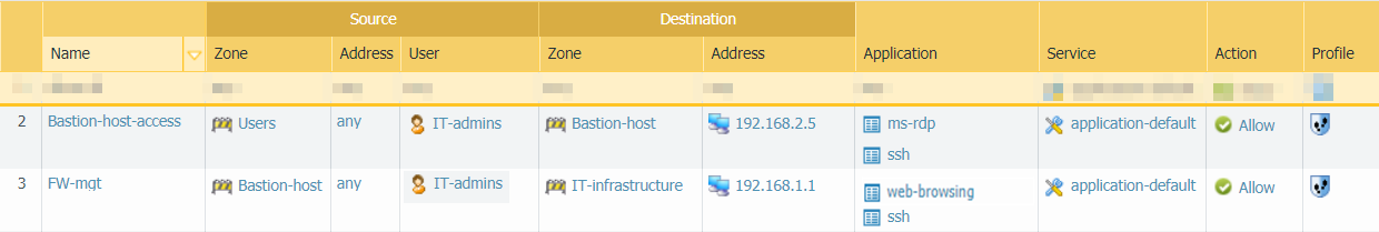- If you are using a bastion host to enable access to your management network, you need two security policy rules: one rule to allow access from user zone to the bastion host zone and a second rule to allow access from the bastion host zone to the IT infrastructure zone. Again, both of these security policy rules should be as granular as possible and include source zone, address (if available), user and destination zone and address, and the App-ID. Keep in mind that if you are using a bastion host, the user IP address is usually the IP address of the bastion host so you cannot identify the User-ID for the administrator unless you are using the Terminal Server agent on the bastion host to identify individual users. In this case, you must also attach a Vulnerability Protection profile to both rules, as described in the next section.In the example rules that follow, the first rule allows access from the Users zone to the Bastion-host zone for users in the IT-admins group who are attempting to access the specified bastion server IP address over SSH and/or RDP. The second rule allows access to users from the Bastion-host zone to the IT-infrastructure zone attempting to access the web-browsing application on the default port on the firewall with the specified destination address.