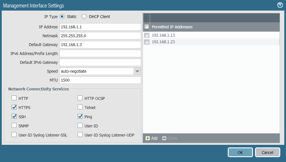 - If you are using the MGT port as your management interface, select DeviceSetupInterfaces and select the Management interface to configure the settings to restrict who can access the management interface and what services the interface allows.