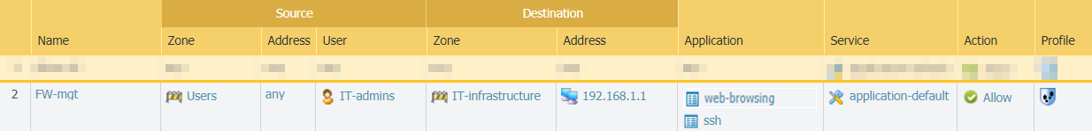- If you are not using a bastion host to isolate your management network, create a security policy rule to allow access from the Users zone to the IT Infrastructure zone. This security policy rule must be very granular and specify the source zone, source IP address (if available), and source user group of the user attempting to access the management interface, as well as the destination zone, IP address of the appliance (firewall or Panorama), and the App-ID to identify the specific management application (web interface or CLI) running on the application default port. For example, you would use the web-browsing App-ID to allow access to the web interface and the ssh App-ID to allow access to the CLI. You must also attach a Vulnerability Protection profile to the rule, as described in the next section.The following example rule allows access from the users zone directly to the IT Infrastructure zone, and restricts access to users in the IT-admins group who are attempting to access the management interface IP address to access the web-browsing application on the application-default port only: