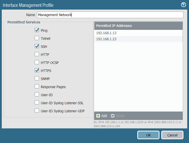 - If you are using a data port as your management interface, after you configure the interface, select NetworkNetwork ProfilesInterface Mgmt and Add an interface management profile to restrict who can access the management interface and what services the interface allows.Do not attach an interface management profile that allows Telnet, SSH, HTTP, or HTTPS to an interface where you have configured a GlobalProtect portal or gateway because this will expose the management interface to the internet. Do not use HTTP or Telnet for any management interface profile because those protocols transmit in cleartext.