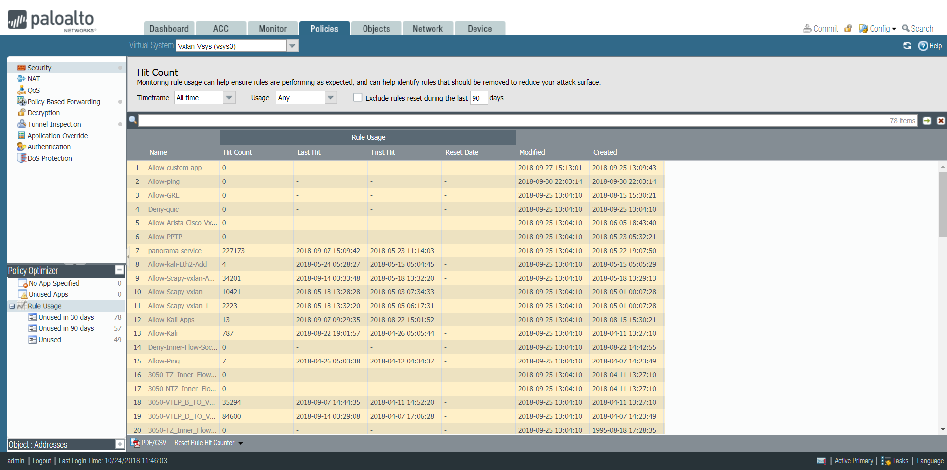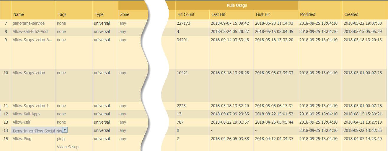 - Created—The date and time the policy rule was created.If the rule was created when Panorama was running PAN-OS 8.1 and the Policy Rule Hit Count setting is enabled, the First Hit date and time is used as the Created date and time on upgrade to PAN-OS 9.0. If the rule was created in PAN-OS 8.1 when the Policy Rule Hit Count setting was disabled or if the rule was created when Panorama was running PAN-OS 8.0 or an earlier release, the Created date for the rule will be the date and time you successfully upgraded Panorama to PAN-OS 9.0