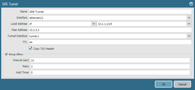 (Best Practice) Enable the Keep Alive function for the GRE tunnel.If Keep Alive is enabled, by default it takes three unreturned keepalive packets (Retries) at 10-second intervals for the GRE tunnel to go down and it takes five Hold Timer intervals at 10-second intervals for the GRE tunnel to come back up.- Select Keep Alive to enable the keepalive function for the GRE tunnel (default is disabled).(Optional) Set the Interval (sec) (in seconds) between keepalive packets that the local end of the GRE tunnel sends to the tunnel peer. This is also the interval that, when multiplied by the Hold Timer, is the length of time that the firewall must see successful keepalive packets before the GRE tunnel comes back up (range is 1 to 50; default is 10). Setting an interval too small will cause many keepalive packets that might be unnecessary in your environment and will require extra bandwidth and processing. Setting an interval too large can delay failover because error conditions might not be identified immediately.(Optional) Enter the Retry setting, which is the number of intervals that keepalive packets are not returned before the firewall considers the tunnel peer down (range is 1 to 255; default is 3). When the tunnel is down, the firewall removes routes associated with the tunnel from the forwarding table. Configuring a retry setting helps avoid taking measures on a tunnel that is not really down.(Optional) Set the Hold Timer, which is the number of Intervals that keepalive packets are successful, after which the firewall re-establishes communication with the tunnel peer (range is 1 to 64; default is 5).Click OK.Configure a routing protocol or static route to route traffic to the destination by way of the GRE tunnel. For example, Configure a Static Route to the network of the destination server and specify the egress Interface to be the local tunnel endpoint (tunnel.1). Configure the Next Hop to be the IP address of the tunnel at the opposite end. For example, 192.168.2.3.Commit your changes.Configure the opposite end of the tunnel with its public IP address, its local and peer IP addresses (that correspond to the peer and local IP addresses, respectively, of the GRE tunnel on the firewall), and its routing protocol or static route.Verify that the firewall can communicate with the tunnel peer over the GRE tunnel.