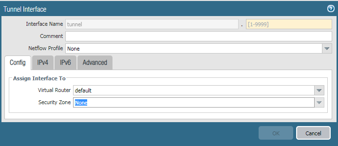 - Select NetworkInterfacesTunnel.Add a tunnel and enter the tunnel Interface Name followed by a period and a number (range is 1 to 9,999). For example, tunnel.1.On the Config tab, assign the tunnel interface to a Virtual Router.Assign the tunnel interface to a Virtual System if the firewall supports multiple virtual systems.Assign the tunnel interface to a Security Zone.