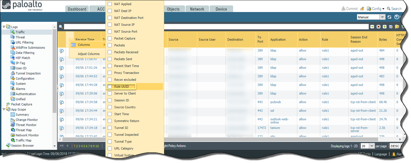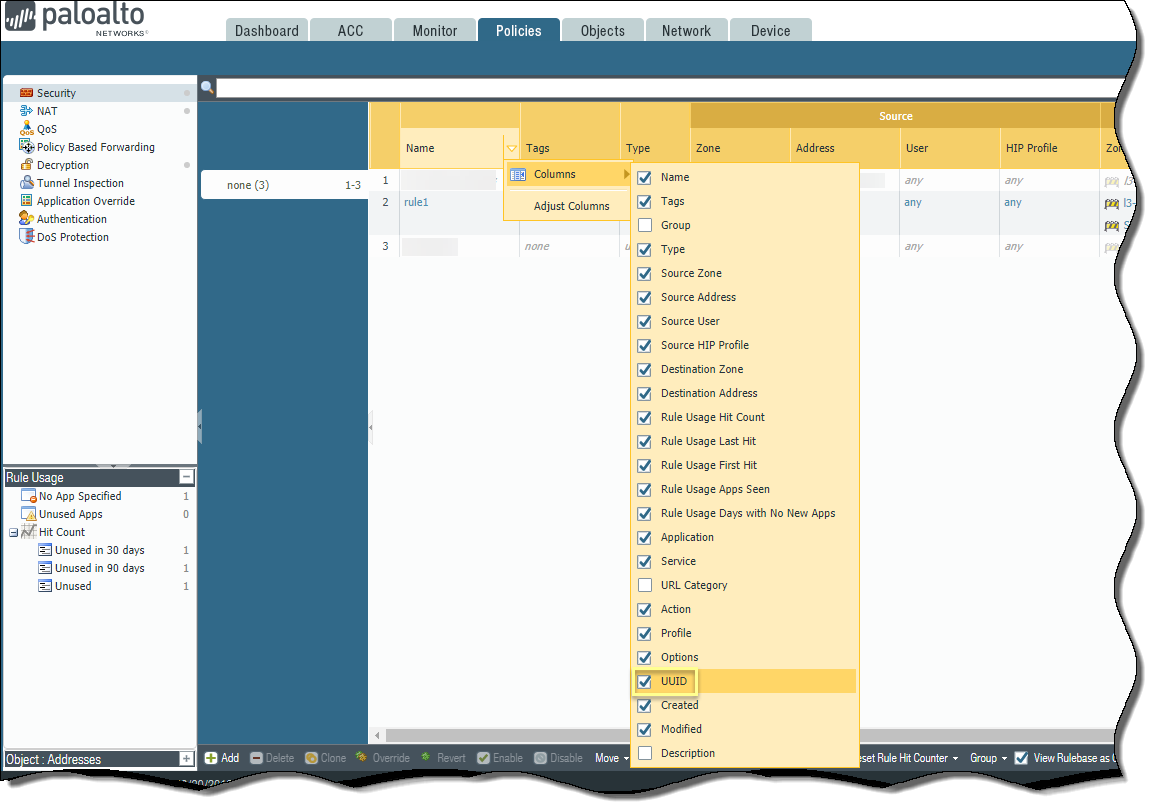 - Display the Rule UUID column for logs and the UUID column for policy rules.To view the UUIDs, you must display the column, which does not display by default.
