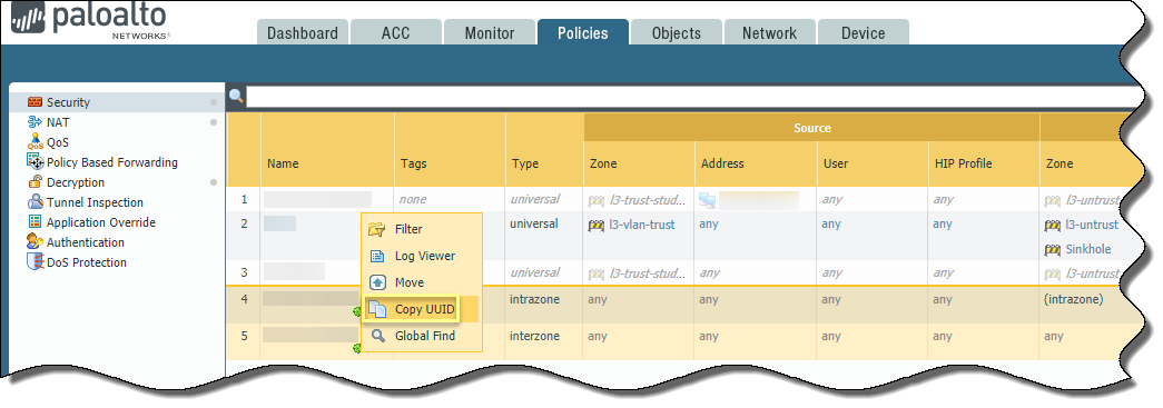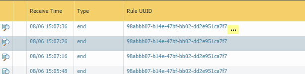 Copy the UUID for a log or policy rule.Copying the UUID allows you to paste the UUID in to searches, the ACC, custom reports, filters, and anywhere else you want to locate a rule identified by that UUID.- Select the ellipses that display when you move your cursor over the entry in the Rule UUID column.