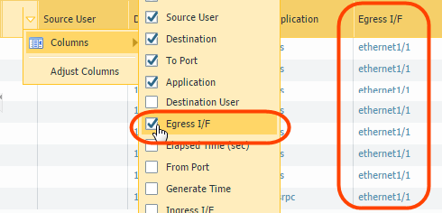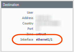 - Click the spyglass icon to the left of any entry to display a detailed log that includes the application’s egress interface, as well as source and destination zones, in the Source and Destination sections: