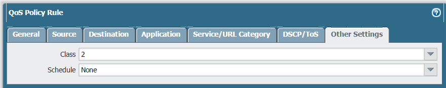 Select Other Settings and select a QoS Class to assign to the QoS policy rule. For example, assign Class 2 to web-browsing traffic on vsys 1: