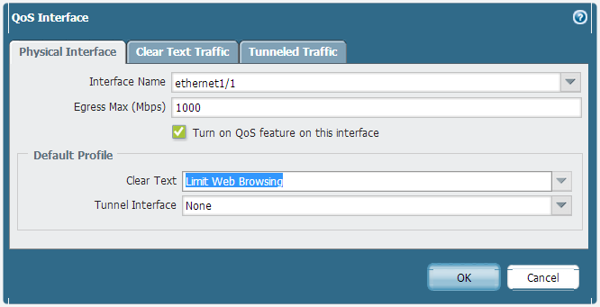 On the Physical Interface tab, select the default QoS profile to apply to all Clear Text traffic.(Optional) Use the Tunnel Interface field to apply a default QoS profile to all tunneled traffic.(Optional) On the Clear Text Traffic tab, configure additional QoS settings for clear text traffic:- Set the Egress Guaranteed and Egress Max bandwidths for clear text traffic.