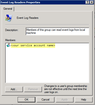 2. If you want to use server monitoring to identify users, add the service account to the Event Log Reader builtin group to enable privileges for reading the security log events.