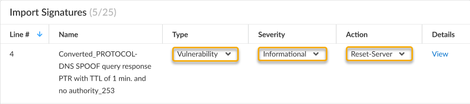 The default Severity level and Action for a converted signature is inherited from the Snort or Suricata signature; while the Type is set to Vulnerability by default.