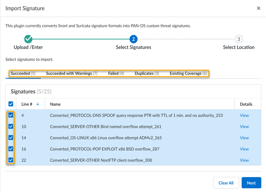 4. The IPS signature conversion results are shown with various statuses for each of the detected entries found in the imported file. Each status type, at a minimum, displays the signature location in the file (based on the line number), as well as an option to View details. You can select valid signature entries for conversion and importation to Strata Cloud Manager.