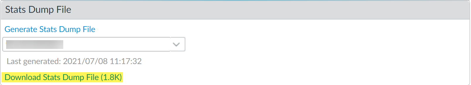 - Log in to the Panorama Web Interface.Select PanoramaSupport and navigate to the Stats Dump File.Select a managed firewall for which to generate a stats dump file.It is recommended that you generate a stats dump file for a single managed firewall from the Panorama web interface.A stats dump file is generated for All devices by default if you do not select a managed firewall.