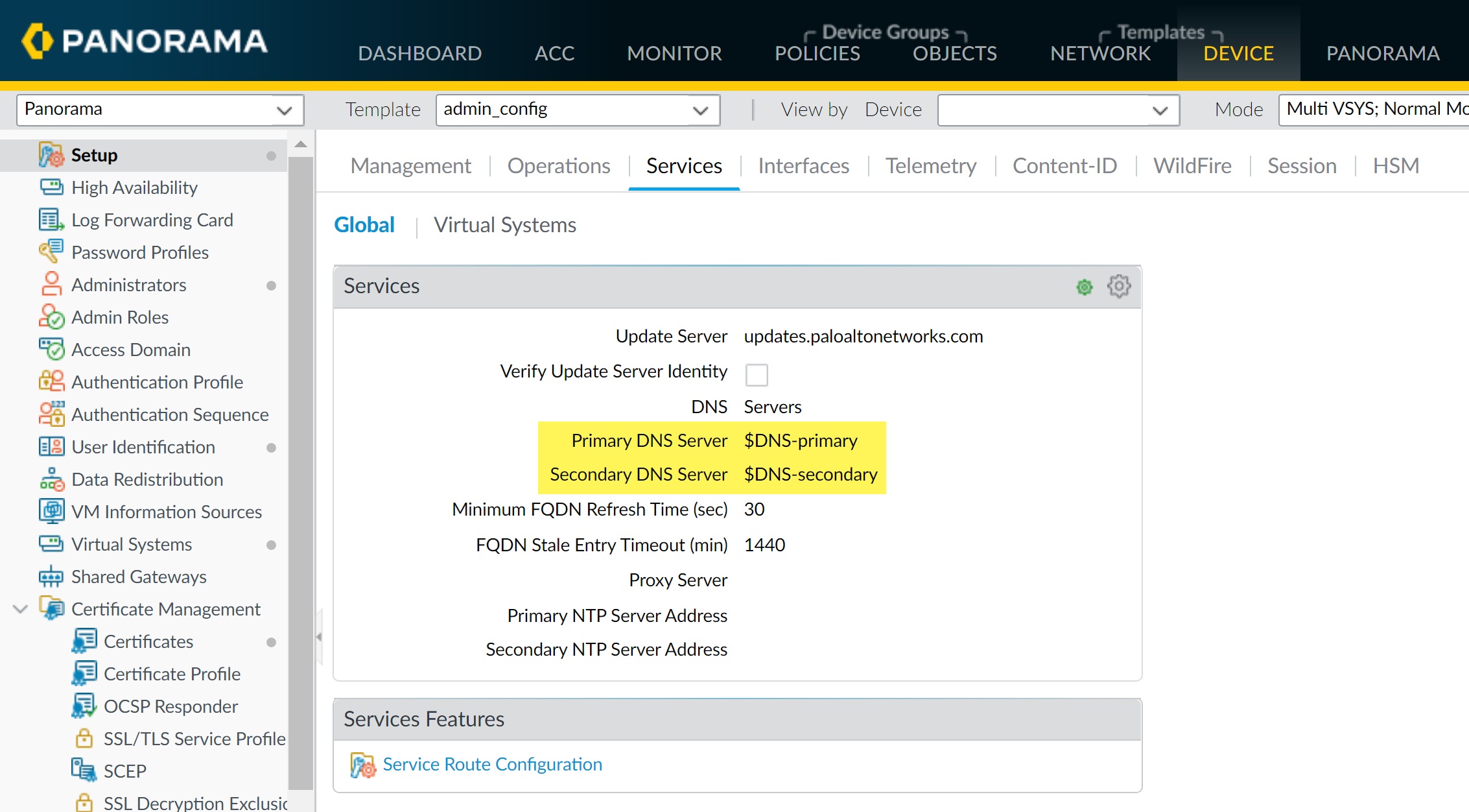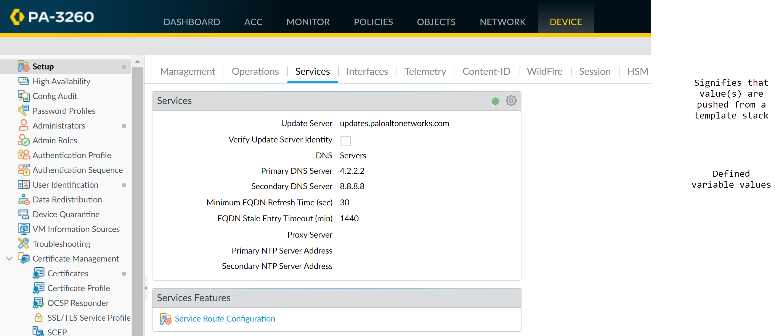 Click Commit and Commit and Push your changes to managed firewalls.When you push a device group configuration with references to template or template stack variables, you must Edit Selections and Include Device and Network Templates.Verify that the values for all variables were pushed to the managed devices.- From the Context drop-down, select a firewall that belongs to the template stack for which the variable was created.Select DeviceSetupServices.Settings with values defined by a template or template stack are indicated by a template symbol (). Hover over the indicator to view to which template or template stack the variable definition belongs. When viewing from the firewall context, the variables display as the IP address you configured for the variable.