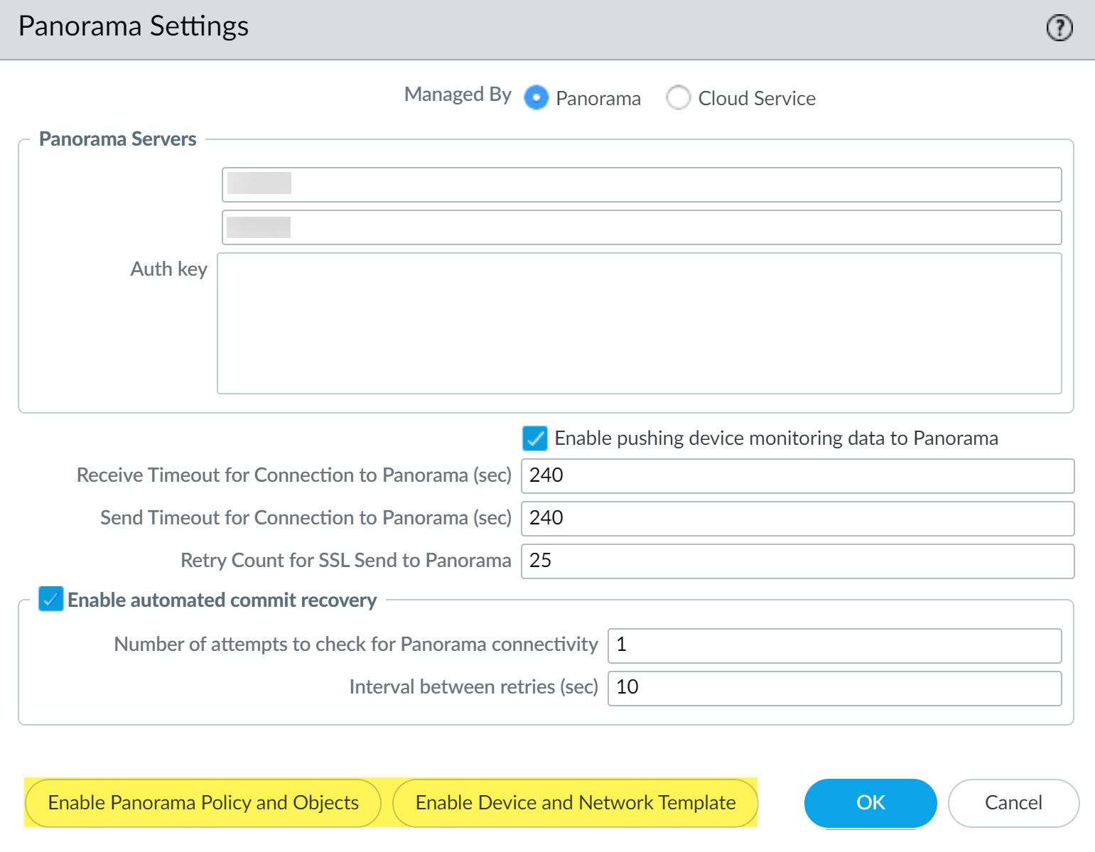 Click OK when prompted to enable Panorama Policy and Objects and Device and Network Template settings. The example below depicts these Panorama Settings configured to allow Panorama-pushed device group and template configurations.