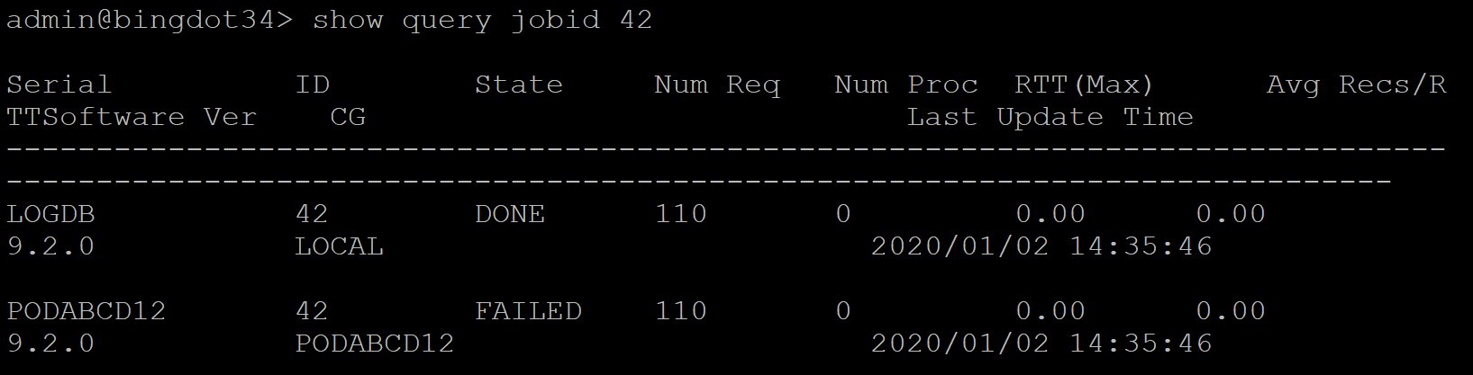 The CLI output includes general information about each executed log query such as the jod ID, when the query was run, the query state, the log database that was queried, the number of logs queried, how long (in ms) it took for the query to return results, the admin that executed the query. and any filters applied to the query.