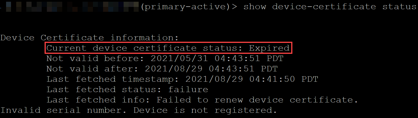 Reinstall the expired device certificate on Panorama, Dedicated Log Collectors, or managed firewalls.If the request certificate fetch otp <otp_value> command is not available, it means the Panorama, Log Collector, or managed firewall is a Trusted Platform Module (TPM) device.To restore the device certificate for a TPM device, run the following command:request certificate fetch