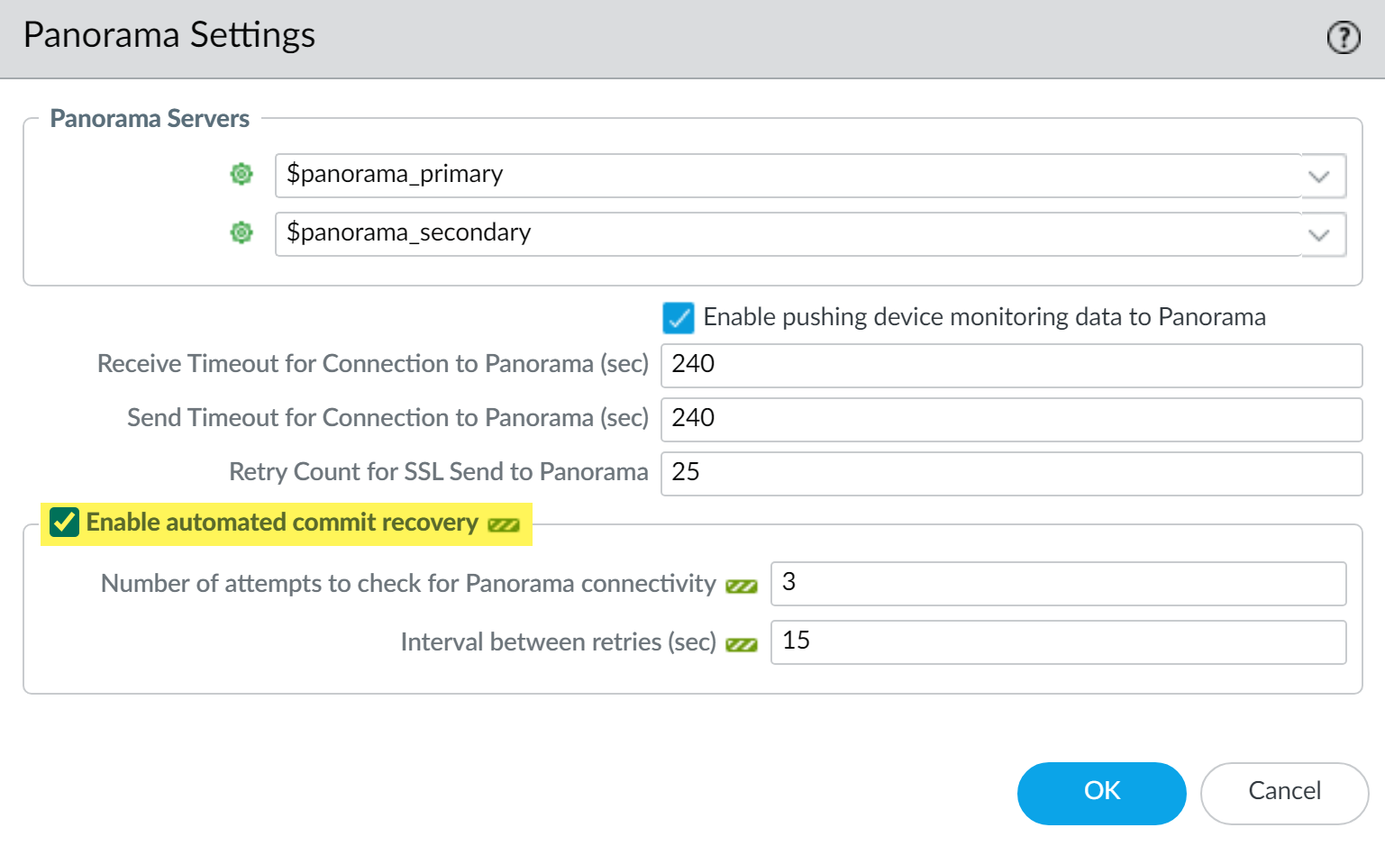 Enable automated commit recovery.Configure the Number of attempts to check for Panorama connectivity (default is 1 attempt).(ZTP Firewalls) Configure the number of attempts as 5 to avoid unintended configuration revets after the first push from Panorama.- Configure the Interval between retries (default is 10 seconds).Click OK to save your changes.