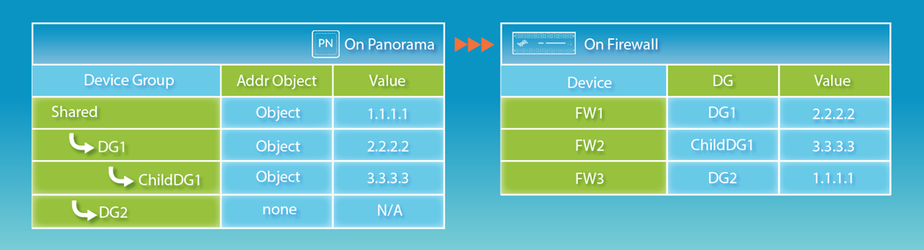 By default, when device groups at different levels in the Device Group Hierarchy have an object with the same name but different values (because of overrides, as an example), policy rules in a descendant device group use the object values in that descendant instead of using object values inherited from ancestor device groups. Optionally, you can reverse this order of precedence to push values from the highest ancestor containing the object to all descendant device groups. After you enable this option, the next time you push configuration changes to device groups, the values of inherited objects replace the values of any overridden objects in the descendant device groups. The figure below demonstrates the precedence of inherited objects in a device group: