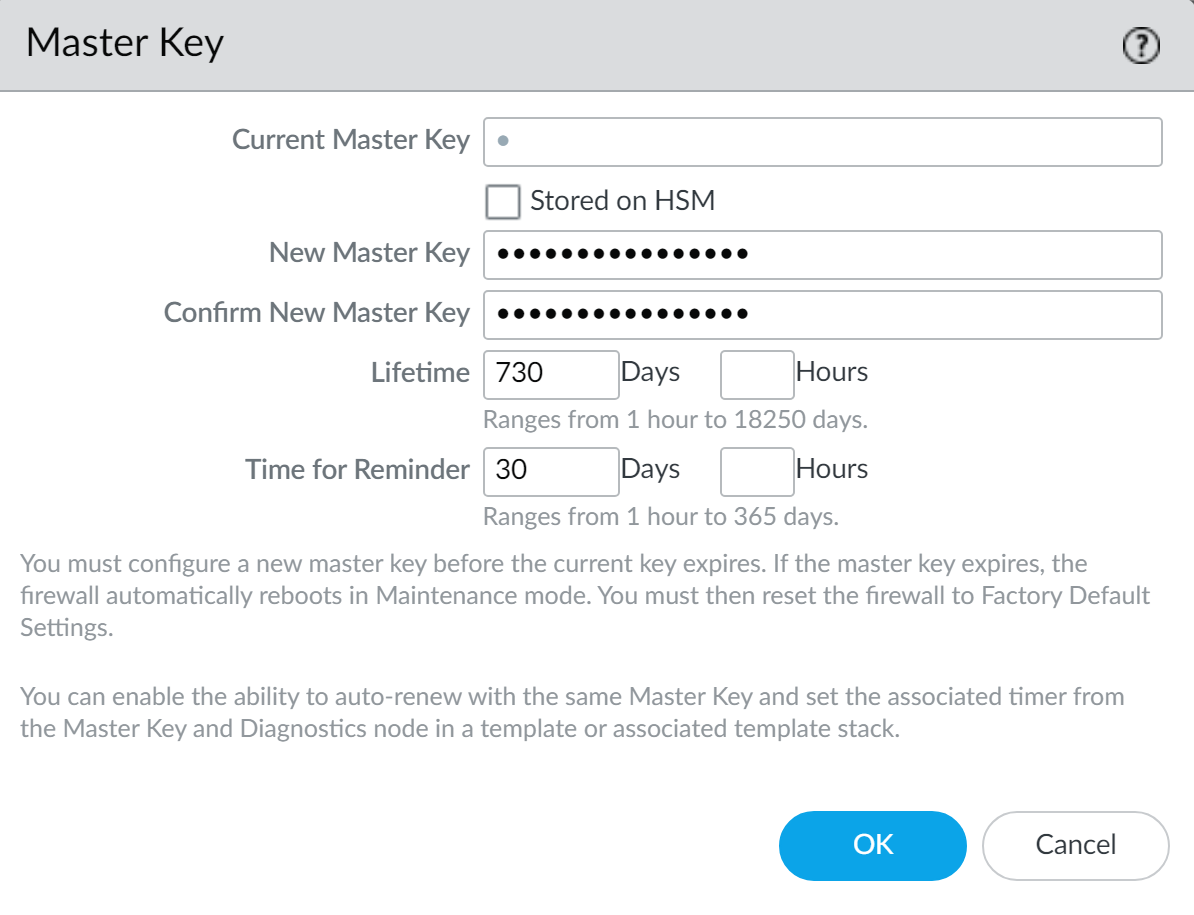 - Click OK.The new master key is automatically pushed to your managed firewalls after you click OK. Proceed only if you are certain you are ready to change the master key for your managed firewalls.