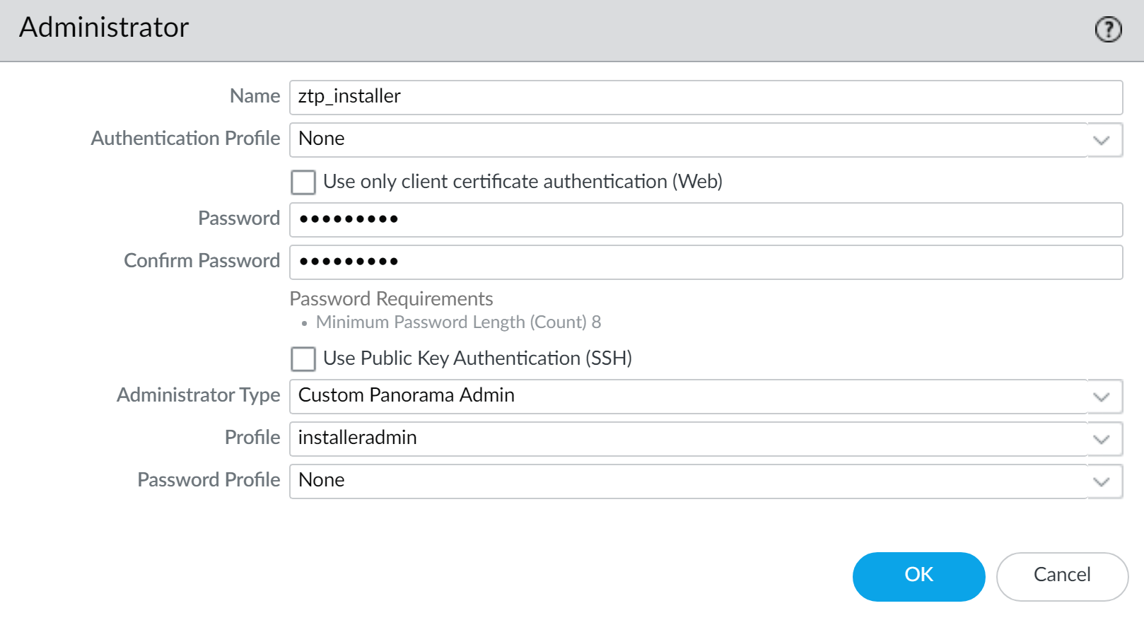 Configure the ZTP installer administrator user.- Select PanoramaAdministrators and Add a new admin user.Enter a descriptive Name for the ZTP installer admin user.Enter a secure Password and Confirm Password.For the Administrator Type, select Custom Panorama Admin.For the Profile, select installeradminClick OK to save your configuration changes.