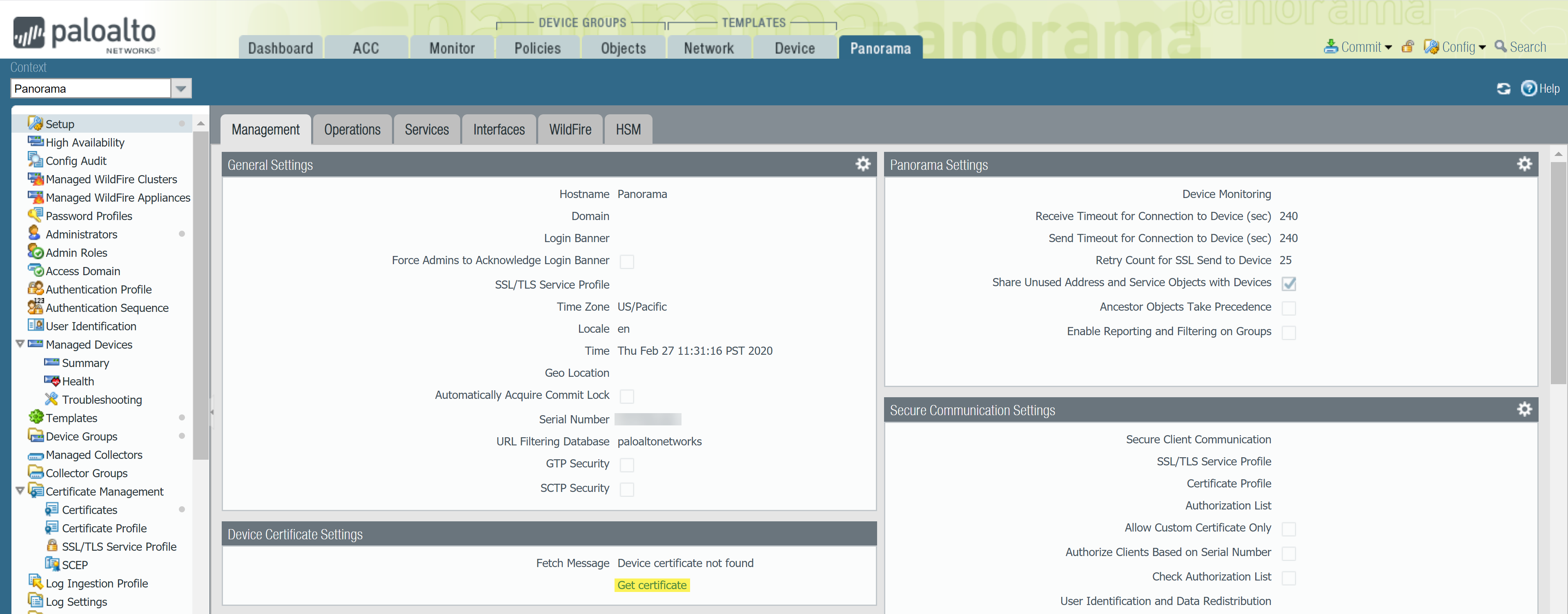 - Select PanoramaSetupManagementDevice Certificate Settings and Get
