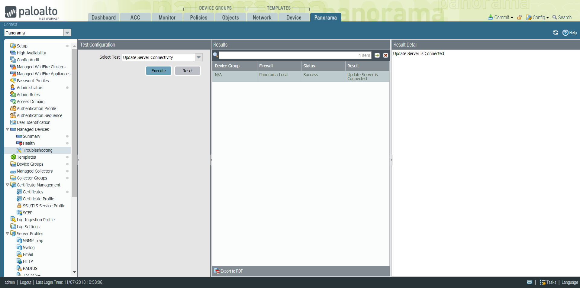- Select PanoramaManaged DevicesTroubleshooting, and select Updates Server Connectivity from the Select Test drop-down.