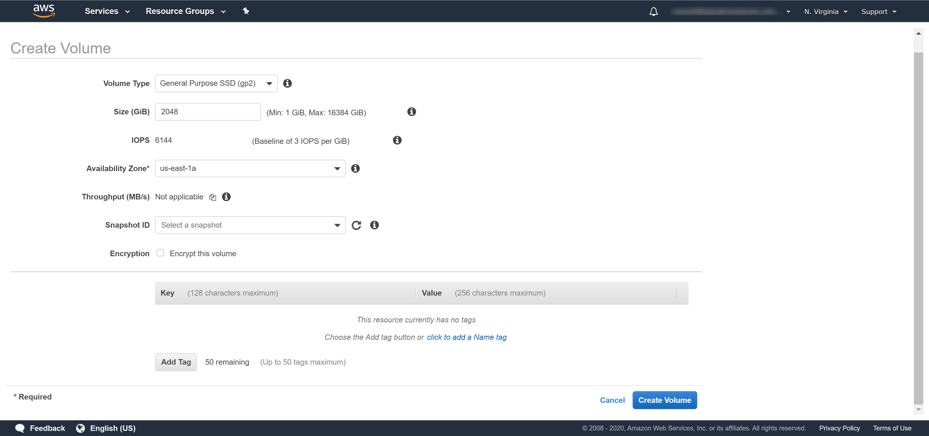 1. On the EC2 Dashboard, select Volumes and Create Volume: