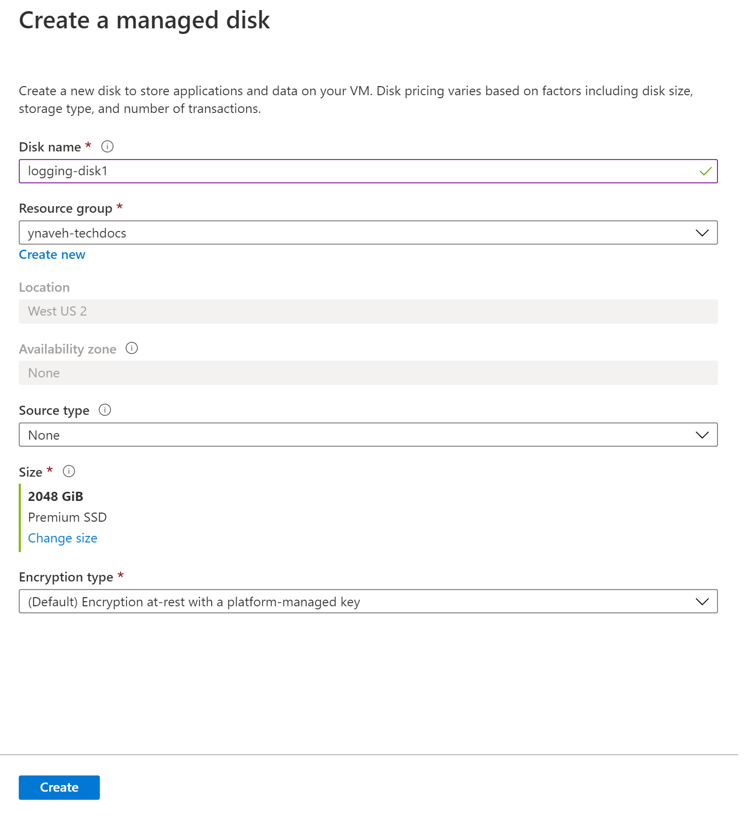 - In the drop-down for the new disk, Create