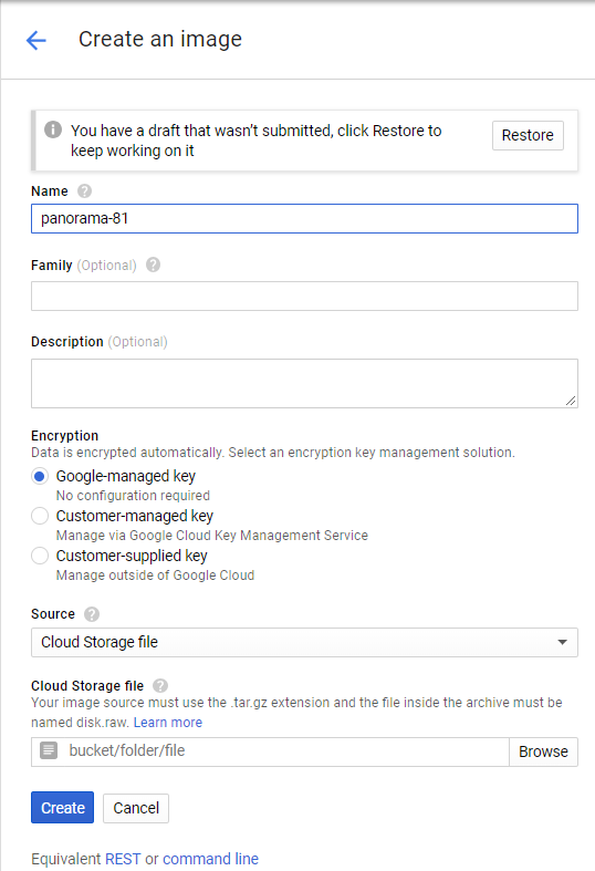 - For the Boot Disk, click ChangeCustom image and select the Panorama image file you uploaded in Step 2