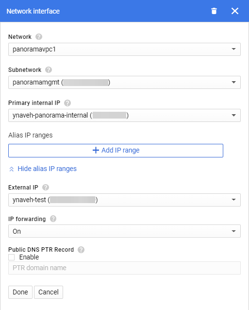 - Set IP forwarding to On to allow the Panorama virtual appliance to receive packets from non-matching destinations or source IP addresses.