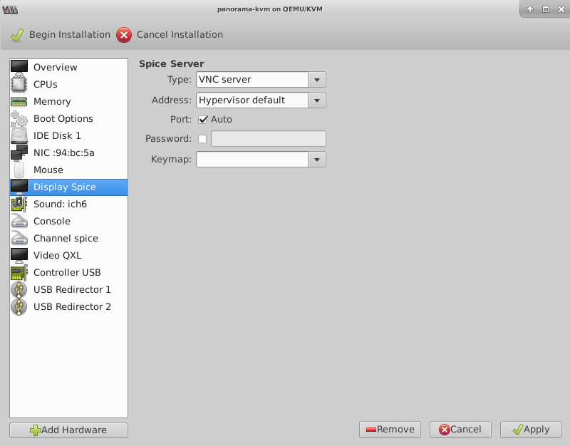 - Select Display Spice.Continue to the next step if Display VNC is listed in the Hardware list because the virtual machine is already configured to use the VNC server for the display.