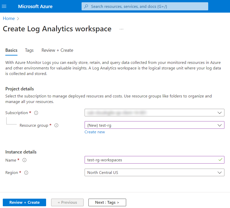 - From the Azure portal, select Log Analytics workspacesCreate.Select the subscription and resource group associated with your current deployment.Enter an instance name for your new Log Analytics workspace using the following format.<resource-group-name>-workspaces