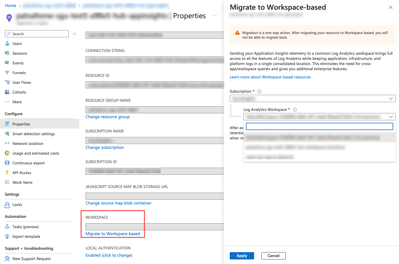 - Log in to the Azure portal.Select Resource GroupsApplication InsightsProperties.If the Workspace field is empty, the Application Insights resource is classic. Continue with this procedure to migrate to a workspace-based resource.Create a Log Analytics workspace.