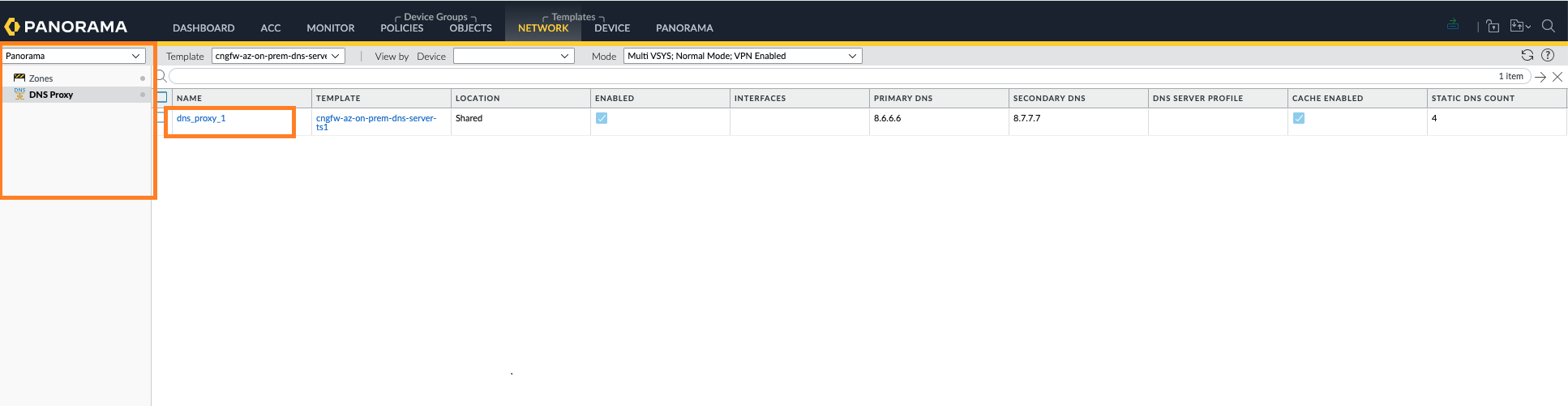 The Panorama plugin for Azure 5.1.2 introduces support for DNS proxy setting display in the Panorama console. Go to the Networks tab in Panorama, and then click DNS proxy to view the DNS proxy settings of your cloud device group.