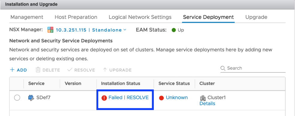 Wait for the service manager status to become Registered.Log in to the vCenter web interface.Select Networking & SecurityInstallationService Deployments.Click Resolve under Installation Status to remove the failed status. This action should be non-disruptive and not disrupt traffic. For questions, consult VMware.